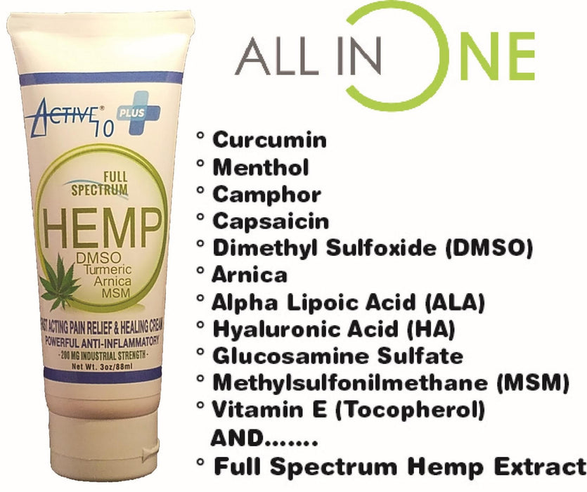 Active 10 delivers Clinically Proven Ingredients including Turmeric, MSM, Arnica, Alpha Lipoic Acid (ALA), Glucosamine, Menthol, Capsaicin, Camphor, DMSO, Vitamin E, and Hyularonic Acid, which will penetrate deep into problematic areas. Vanishing Scent - Made in the USA - Non-Greasy - Non-Staining - Paraben-Free - NEVER Tested on Animals.